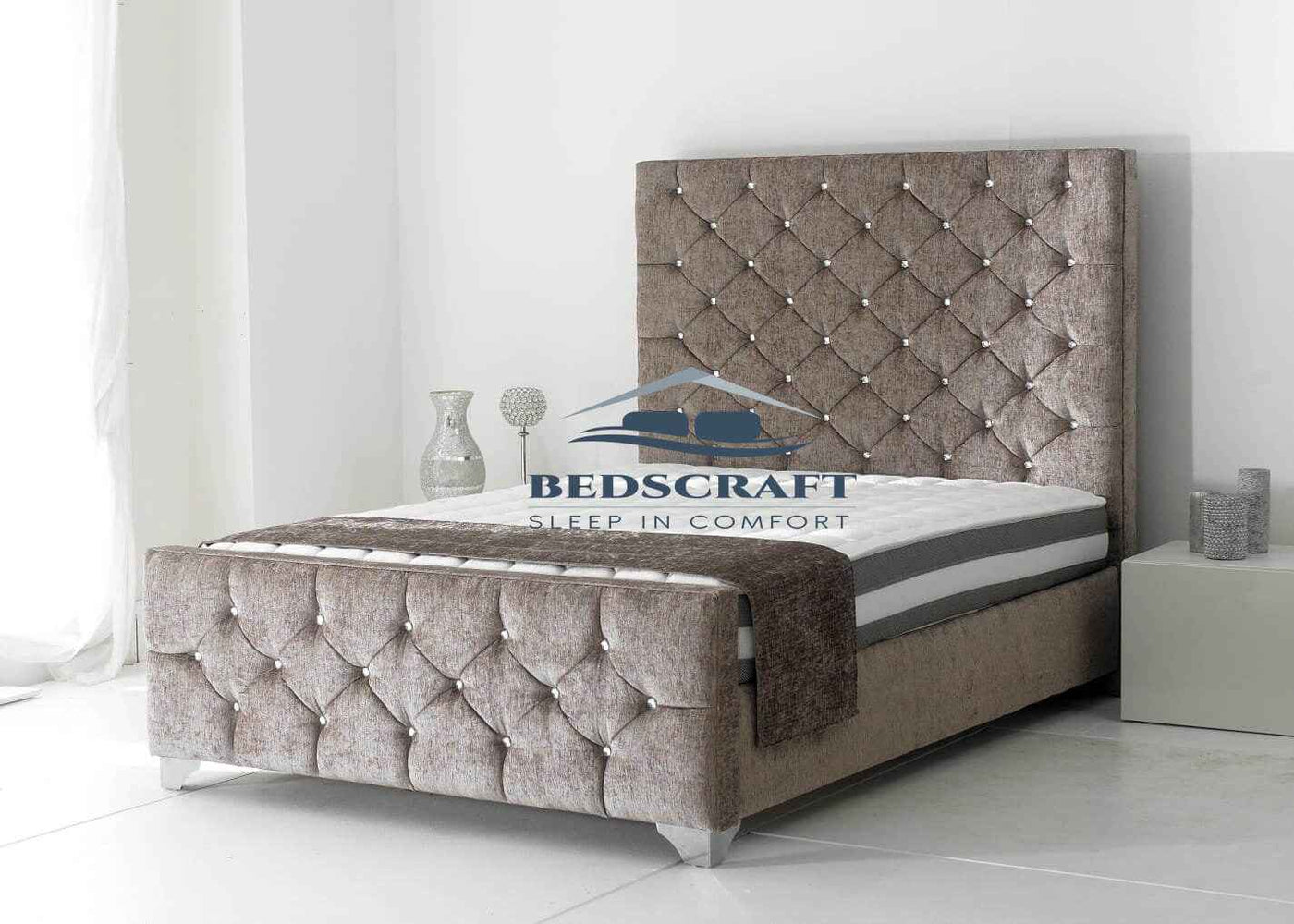 Introducing the Fabric Frame Bed, a harmonious blend of ultra-modern design and traditional elements, handcrafted to perfection for your bedroom. This standout piece features an upholstered Spanish Chesterfield pattern on the high headboard and low footboard, creating a luxurious and stylish centrepiece that's sure to elevate your bedroom decor.
