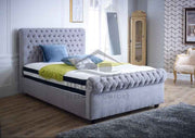 Crafted with precision, the Quebec bed's iconic Chesterfield sleigh bed design is available in a variety of luxurious fabrics such as crushed velvet and plush velvet, creating a tactile experience as delightful as the bed's visual appeal. The sleek silhouette of this Chesterfield sleigh bed, combined with its plush fabric options, offers an irresistible invitation to relax and unwind.