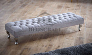 Soft padded footstool/bench hand upholstered in a wide range of quality fabrics. Choice of diamante or matching fabric buttons for upholstered section on top (comes with diamante as standard, please contact if you want fabric buttons) Length comes in standard bed sizes.